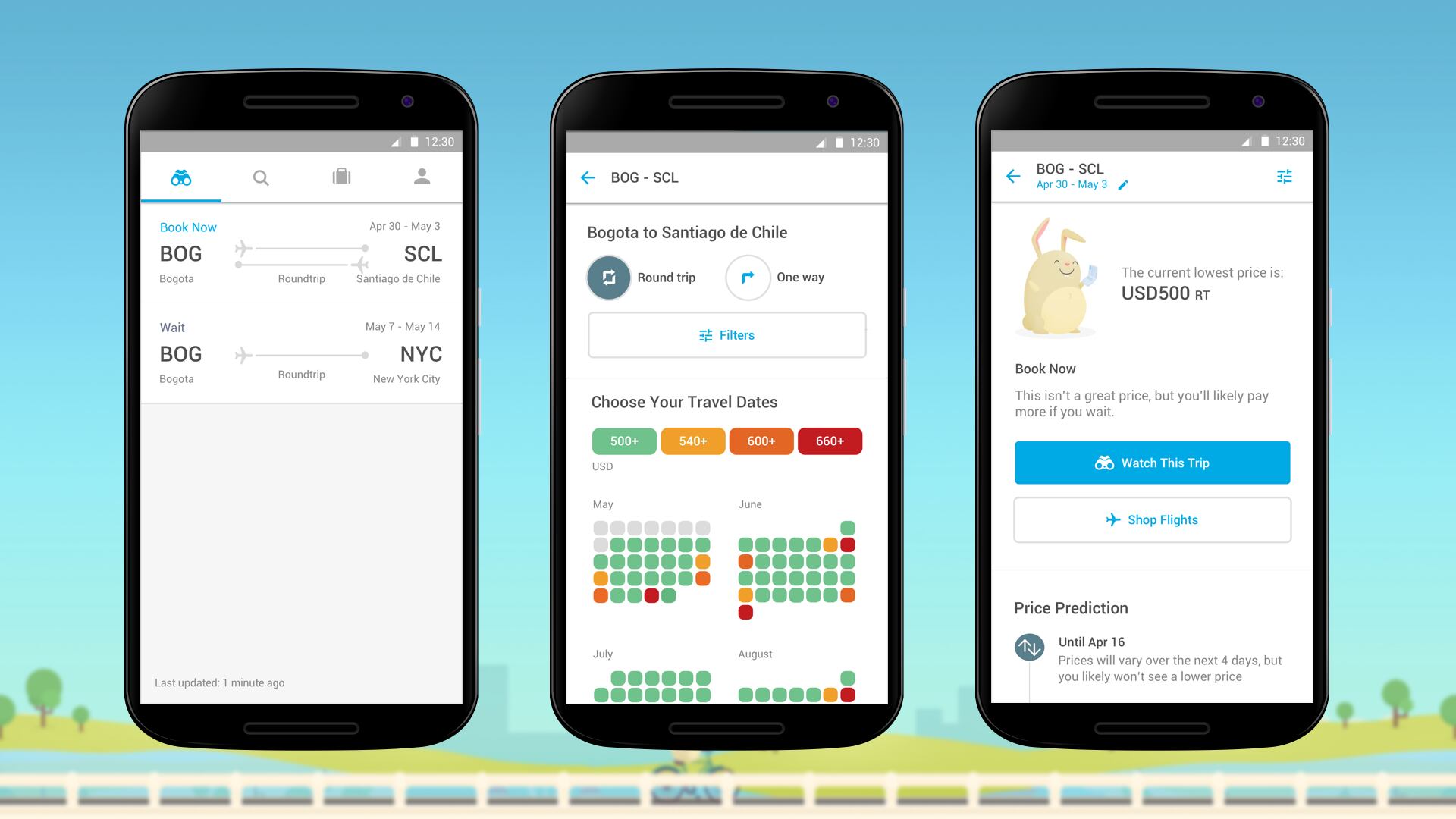 Monitoreo de precios: al monitorear precios de manera continua se podrá encontrar mejores tarifas, inclusive hasta un 5% o 10% más económicas en sólo 24 horas. Al seleccionar la opción Watch a Trip, la app monitorea precios las 24 horas de los siete días de la semana y avisará si los precios bajan o se espera que suban. El usuarios recibe una alerta con una buena oferta. En algunos itinerarios se puede ahorrar hasta un 40%.