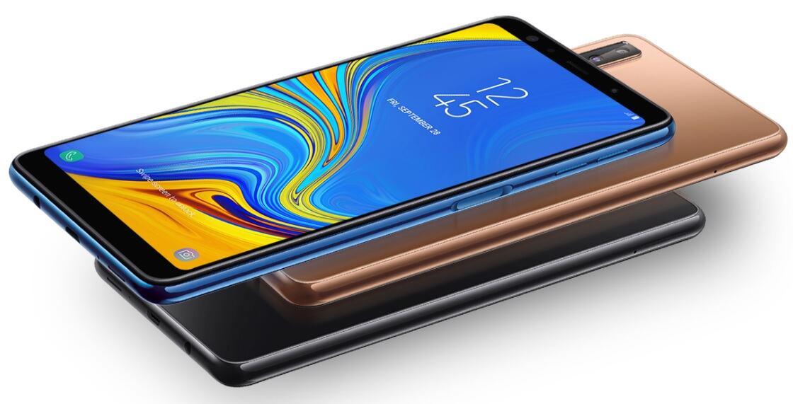 El Galaxy A7 cuenta con una pantalla de full HD de seis pulgadas, 4 GB de memoria RAM, memoria interna de 64 GB (expandible hasta 512 GB con una tarjeta micro SD), batería de 3.300 mAh y funciona con sistema operativo Android 8.0.