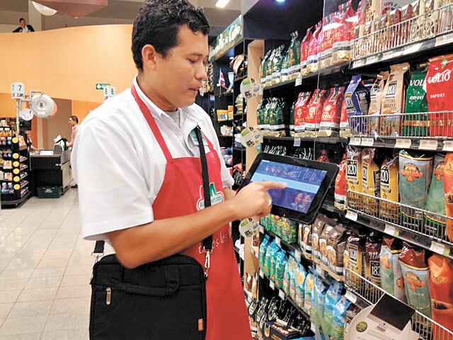 En esta cadena, quienes acomodan y realizan el inventario en las góndolas utilizan tabletas que se conectan a una base de datos que contiene el inventario de productos.