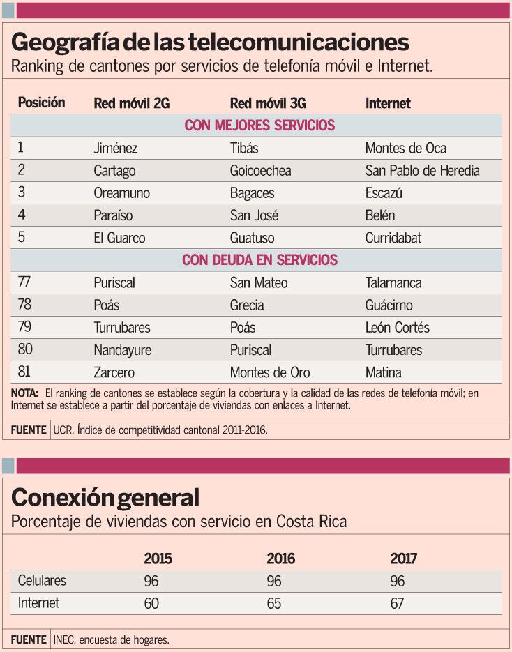Los cantones con mejores servicios son Jiménez, Tibás y Montes de Oca, en telefonía 2G, 3G e Internet, respectivamente (vea tabla "Geografía de las telecomunicaciones").