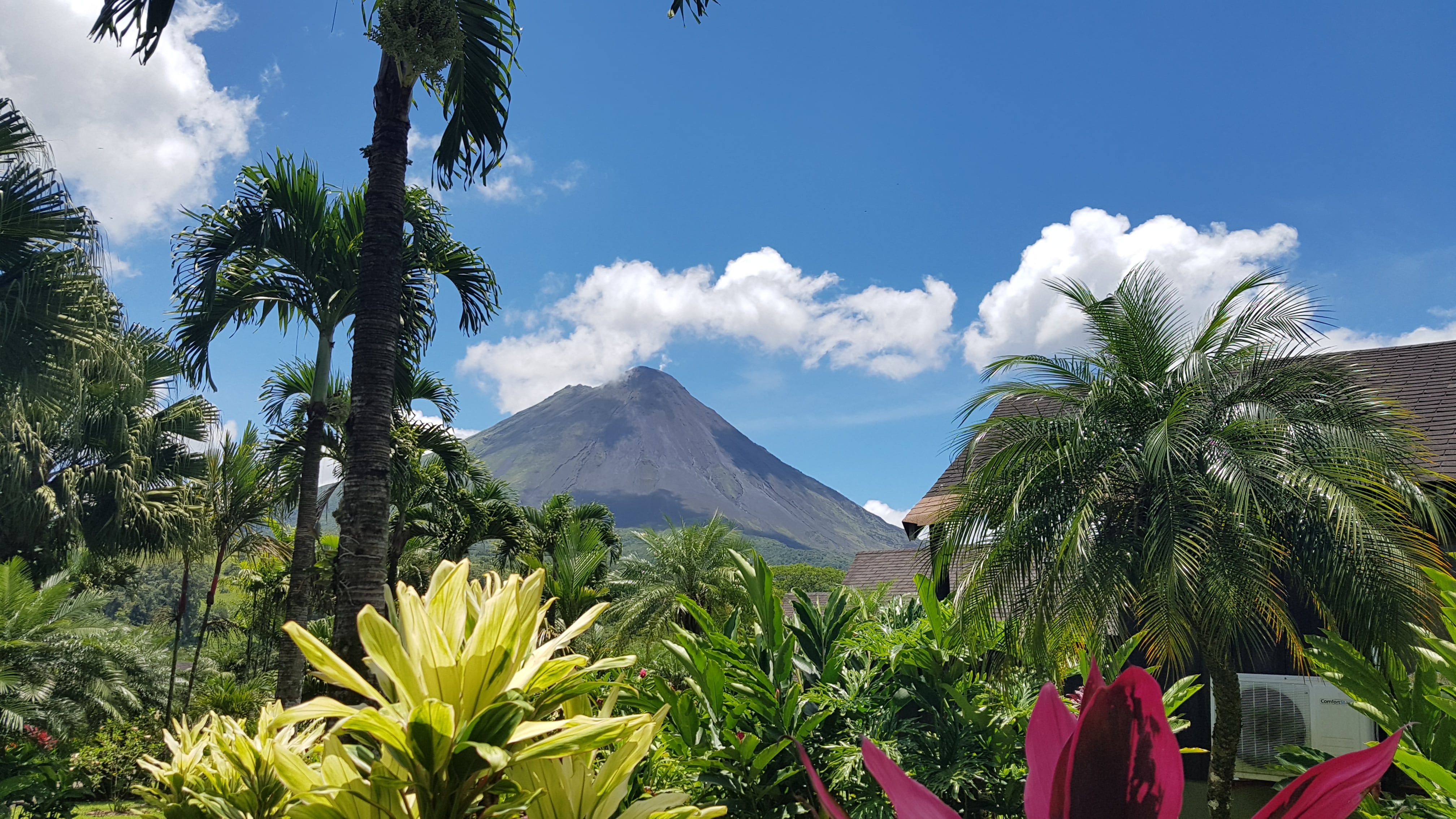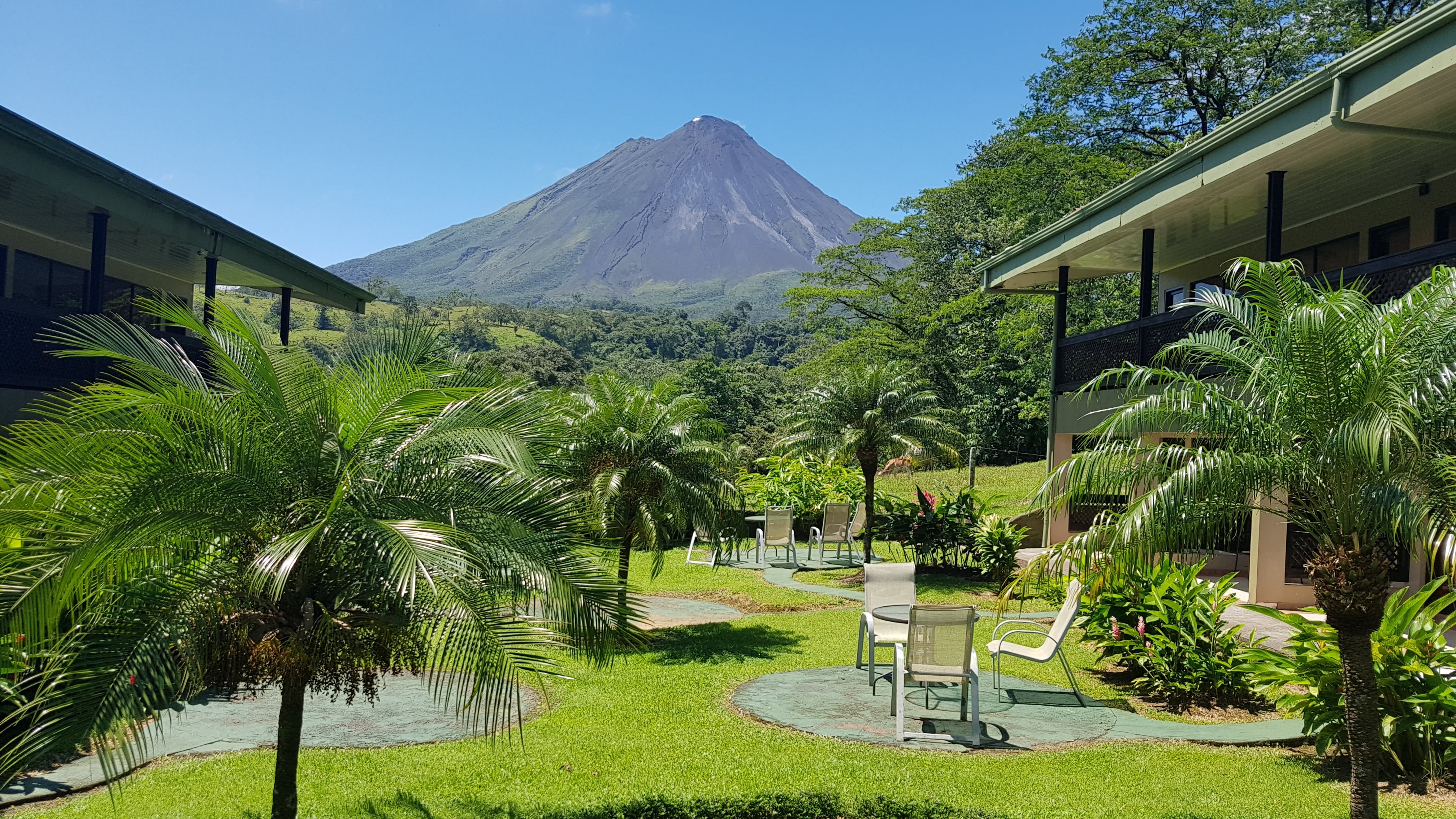 Al puro frente se ubica el Volcán Arenal. Desde el hotel se puede ver la franja de bosque que cubre el costado este del coloso y también la ladera por donde caía el material de sus erupciones.