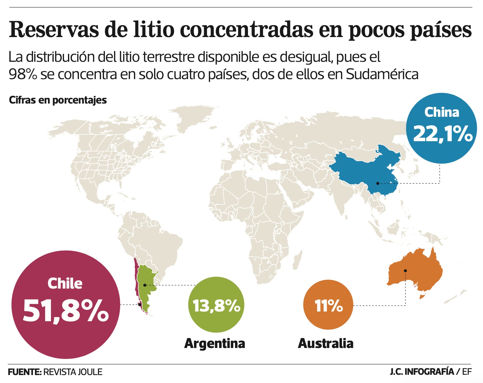Chile posee casi el 52% y Argentina alrededor del 14%. China y Australia completan la lista de los países con más litio. De hecho, las cuatro naciones juntas suman el 98% de los depósitos mundiales, según datos publicados en la revista Joule.