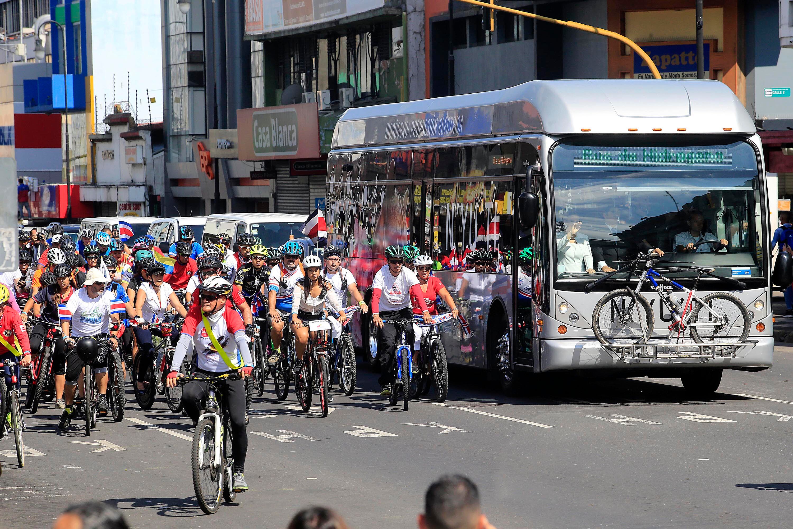 Tratando de demostrar que están en sintonía, el Presidente y su gabinete llegaron a la Plaza de la Democracia en el bus de hidrógeno de Franklin Chang y hasta se hizo un Facebook Live.