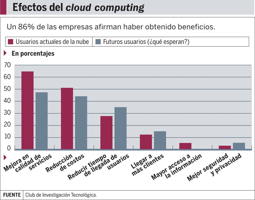 En cuanto a oportunidades, un 86% de las empresas que afirman estar en la nube dicen “obtenier beneficios”. Un 66% mejoró la calidad de los servicios, un 52% redujo costos y 29% la usaron para llegar a los usuarios .