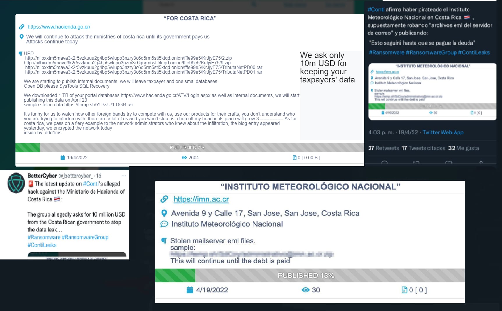 Al día siguiente se les unió un hackeo a la cuenta de Twitter de la Caja Costarricense del Seguro Social, que ningún grupo o hacker se atribuido públicamente, y los anuncios de Conti de haber pirateado el servidor de correo y haber robado correos del Instituto Meteorológico Nacional (IMN). Se le unió otra alerta a Radiográfica Costarricense S.A. (Racsa), según el reporte de Better Cyber, una cuenta en redes sociales que monitorea casos de hackeo.