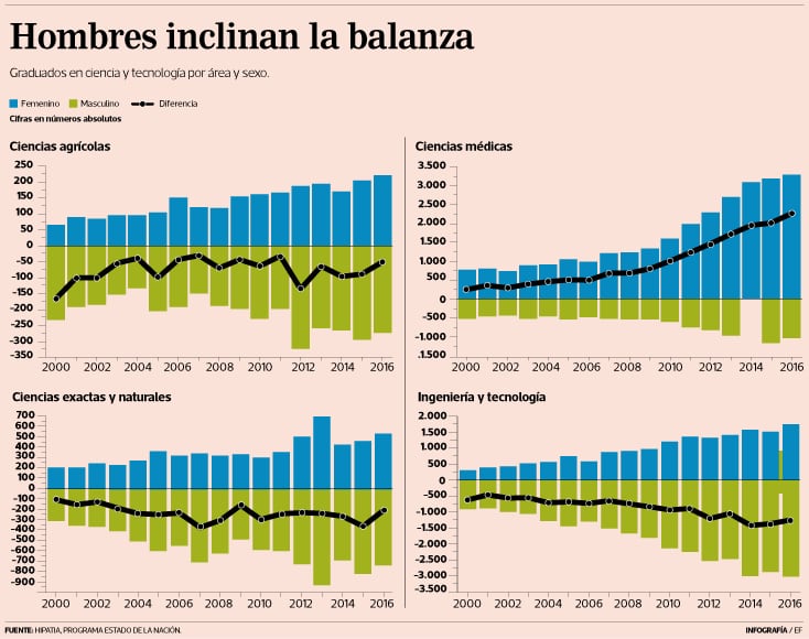 En ciencias agrícolas la participación femenina para ese mismo año fue de 45%. Mientras que en ciencias exactas y naturales se vio un patrón similar al graduarse un 42% de mujeres y un 59% de hombres.