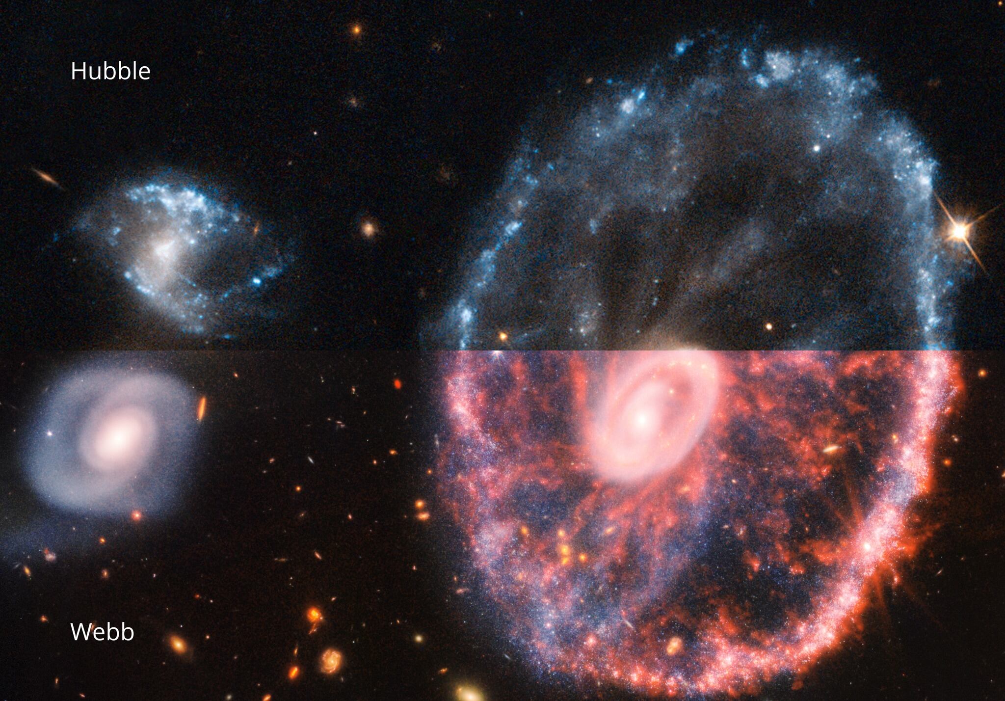 La capacidad de Webb para detectar la luz infrarroja le permitió ver a través de la "enorme cantidad de polvo caliente" que entorpecía la vista de la Galaxia de la Rueda de Carro, afirmaron la NASA y la ESA.