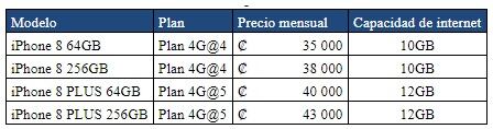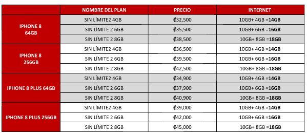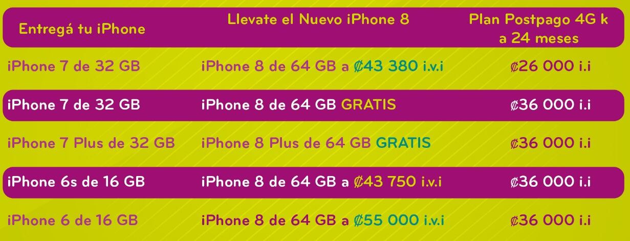 Como parte de su oferta, los clientes con un modelo iPhone 6s, 6 y 7 usados (en todas sus capacidades), adquiridos al mismo ICE, podrán canjearlos por un iPhone 8 o un iPhone 8 Plus o “llevárselos hasta gratis”. El operador ofrece financiamiento con Credix y Credomatic.