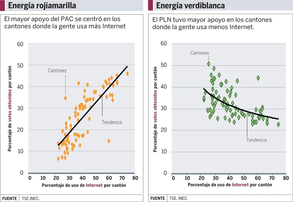 Luis Guillermo Solís, candidato del PAC, ganó principalmente en cantones cuyo porcentaje de usuarios de Internet es alto; es decir, por encima de la media nacional, que es del 41%.
