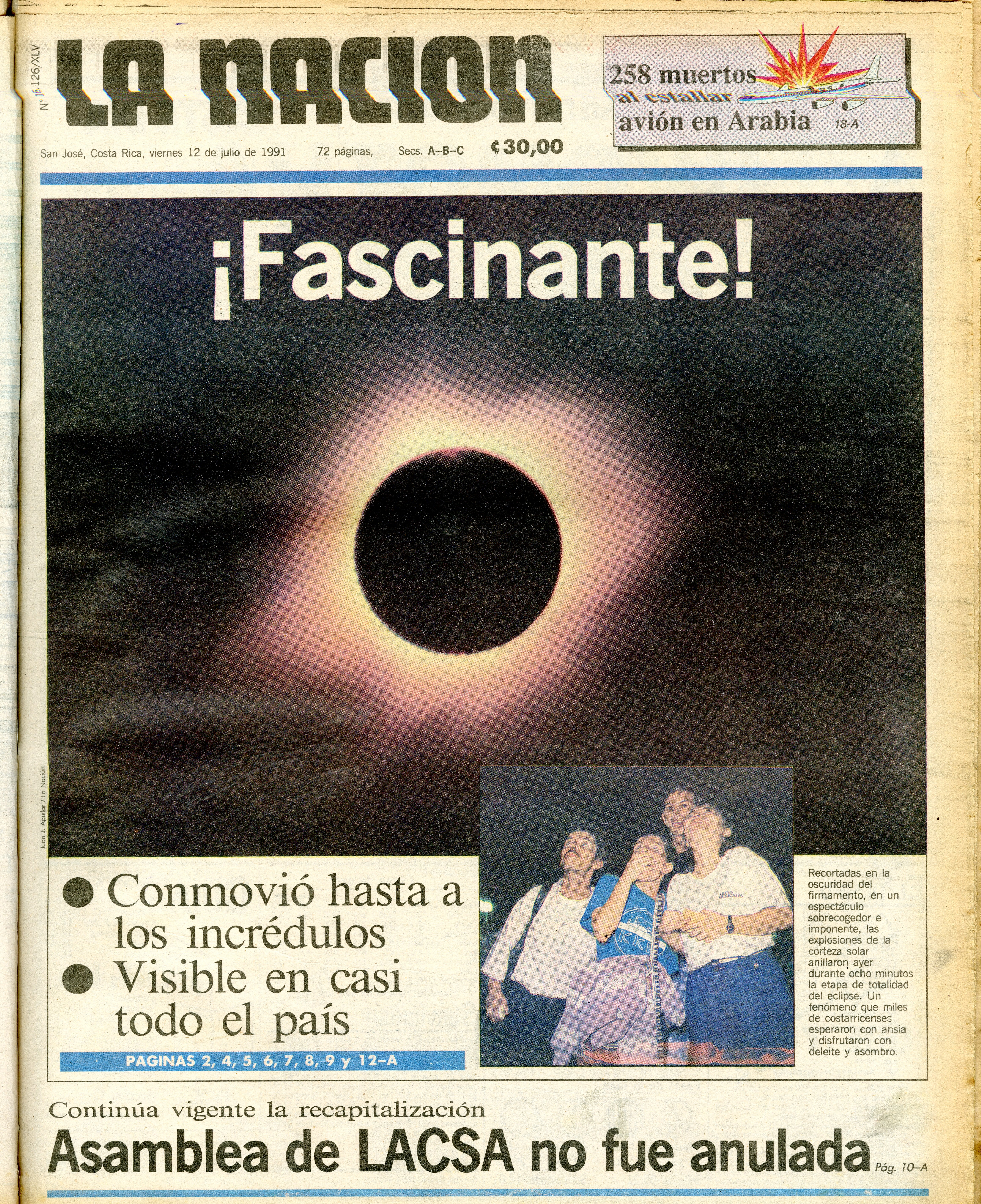 El 11 de julio de 1991 fue un jueves inolvidable para quienes pudieron presenciar en Costa Rica el eclipse total de Sol que comenzó a las 2:01 p.m. y que se convirtió en una breve noche de seis minutos y 53 segundos.