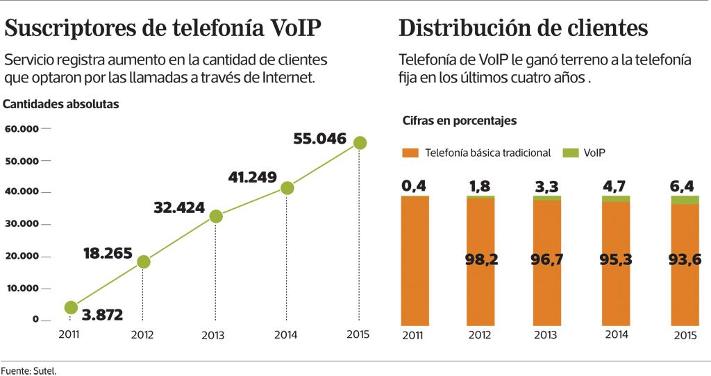 En lo que respecta al año 2015, mientras el servicio VoIP incrementó su número de suscriptores en 13.796, la telefonía tradicional experimentó una reducción de 35.500 clientes.