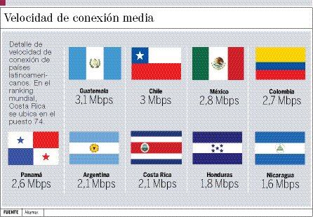 De los nueve primeros lugares, el país se ubicó en la sétima posición detrás de Guatemala, Chile, México, Colombia y Panamá, naciones donde la velocidad de conexión va desde los 3,1 Mbps a los 2,6 Mbps.